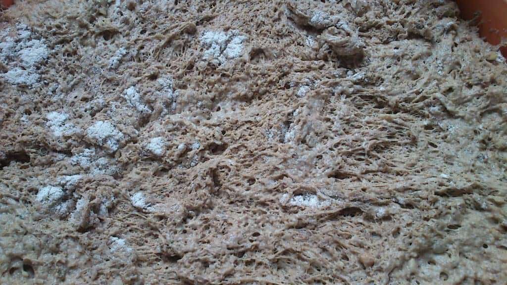 Mix it all and knead the dough well, about 15mins by hand or 10 mins in a machine. Add the remaining flour and work it in. The finished mix will still be very wet, not dry and stringy like a pizza dough.