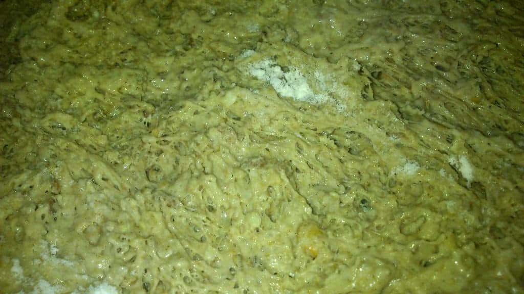 After 15 mins rest time, now add the last items: the soaked seed mix, the 3/4 bit of sourdough, honey and most of the remaining flour.